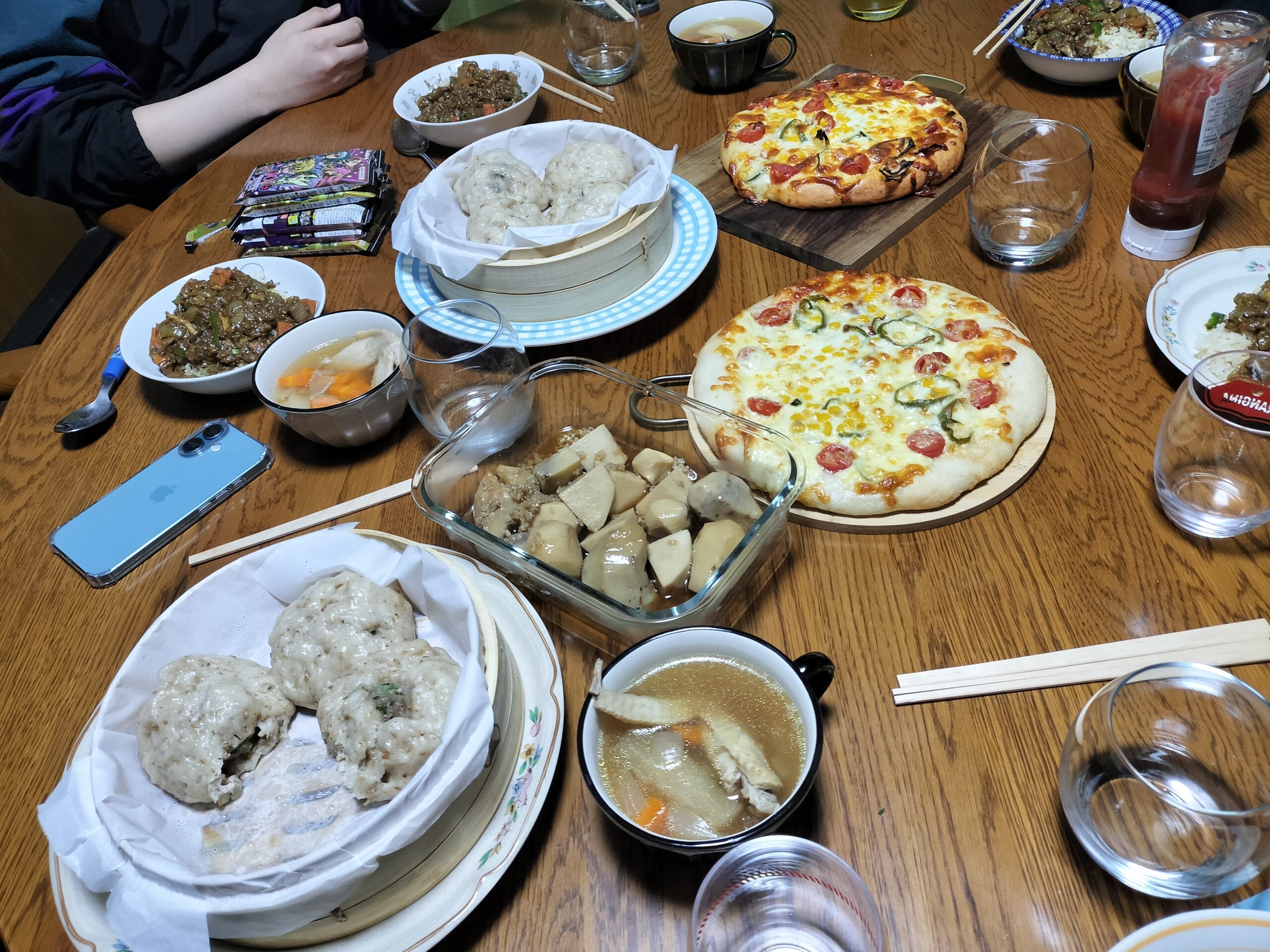 米粉ピザと米粉の肉まん里芋の煮転がし
